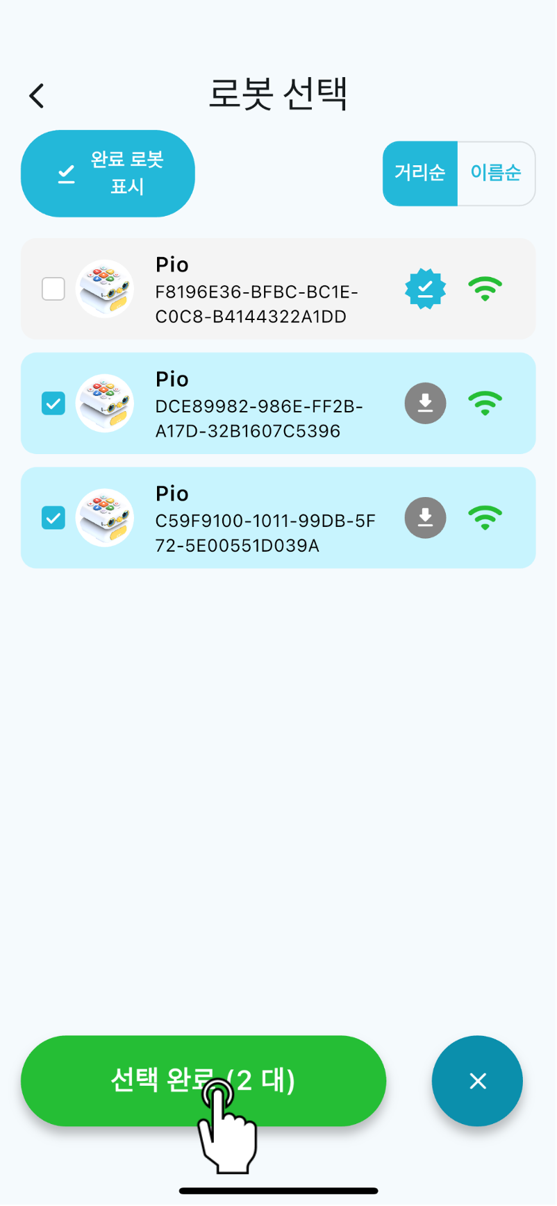 업데이트가 필요한 로봇에는 ‘다운로드’ 아이콘,최신 버전인 로봇은 ‘완료’ 아이콘이 나타납니다.