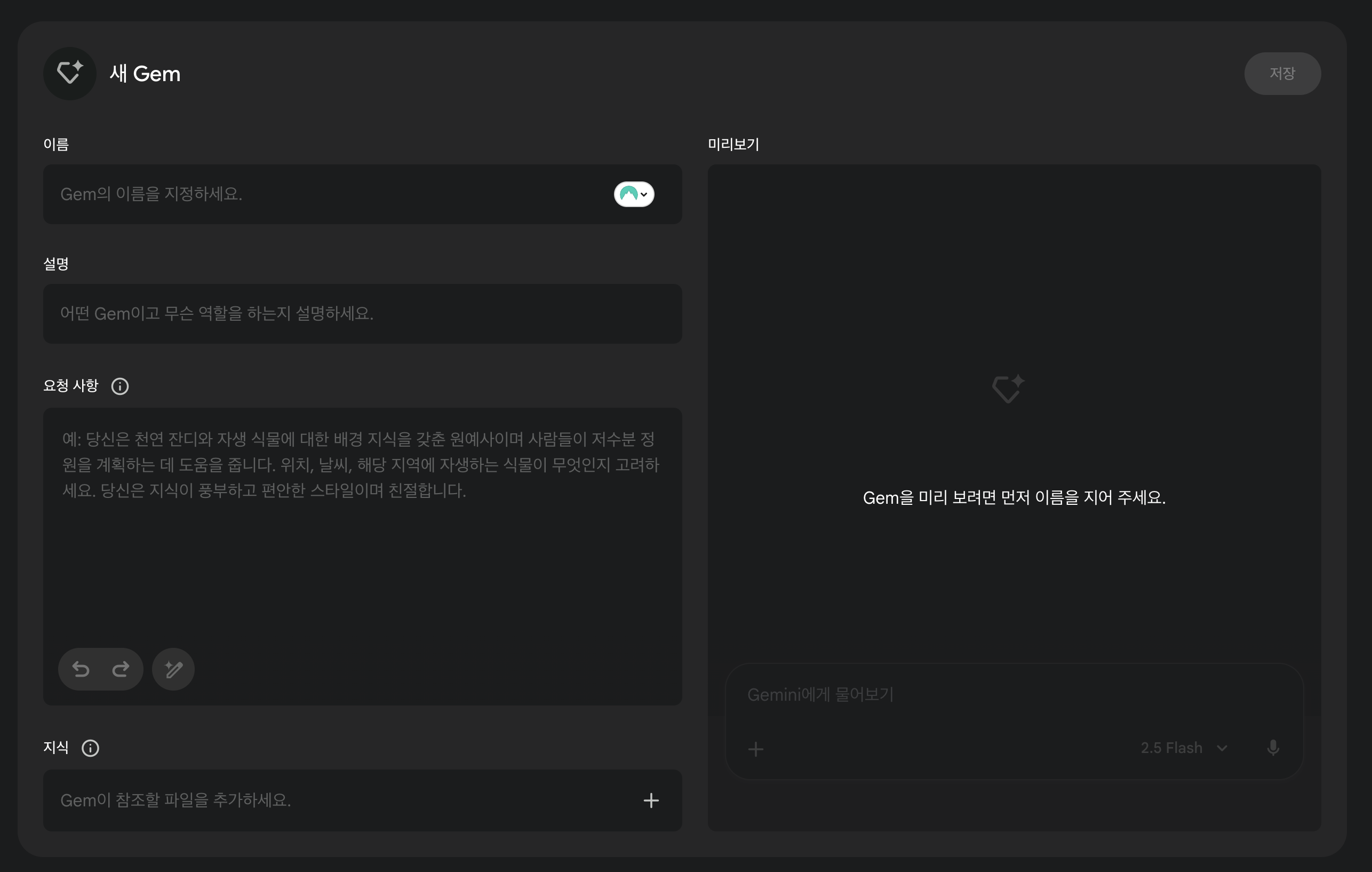 - 요청 사항: Gem을 사용할 목적과 기능, 원하는 대답 스타일 등을 설정할 수 있습니다.